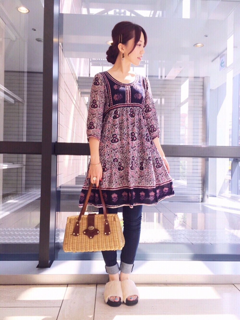 今日は、最近げとした GUのファーサンダルを 履きたくて履きたくて、このコーデに☺️ 白のファー、汚れるかな? と思いつつも、可愛いくて、 買って正解だった🙏 ワンピはもう長いことお気に入りで着倒している、Another editionのもの。 柄と色合いがど真ん中なのです💘 かごバッグはフリマで譲ってもらったもの。フランスのブランドのものらしく、実は裏地も可愛い👜