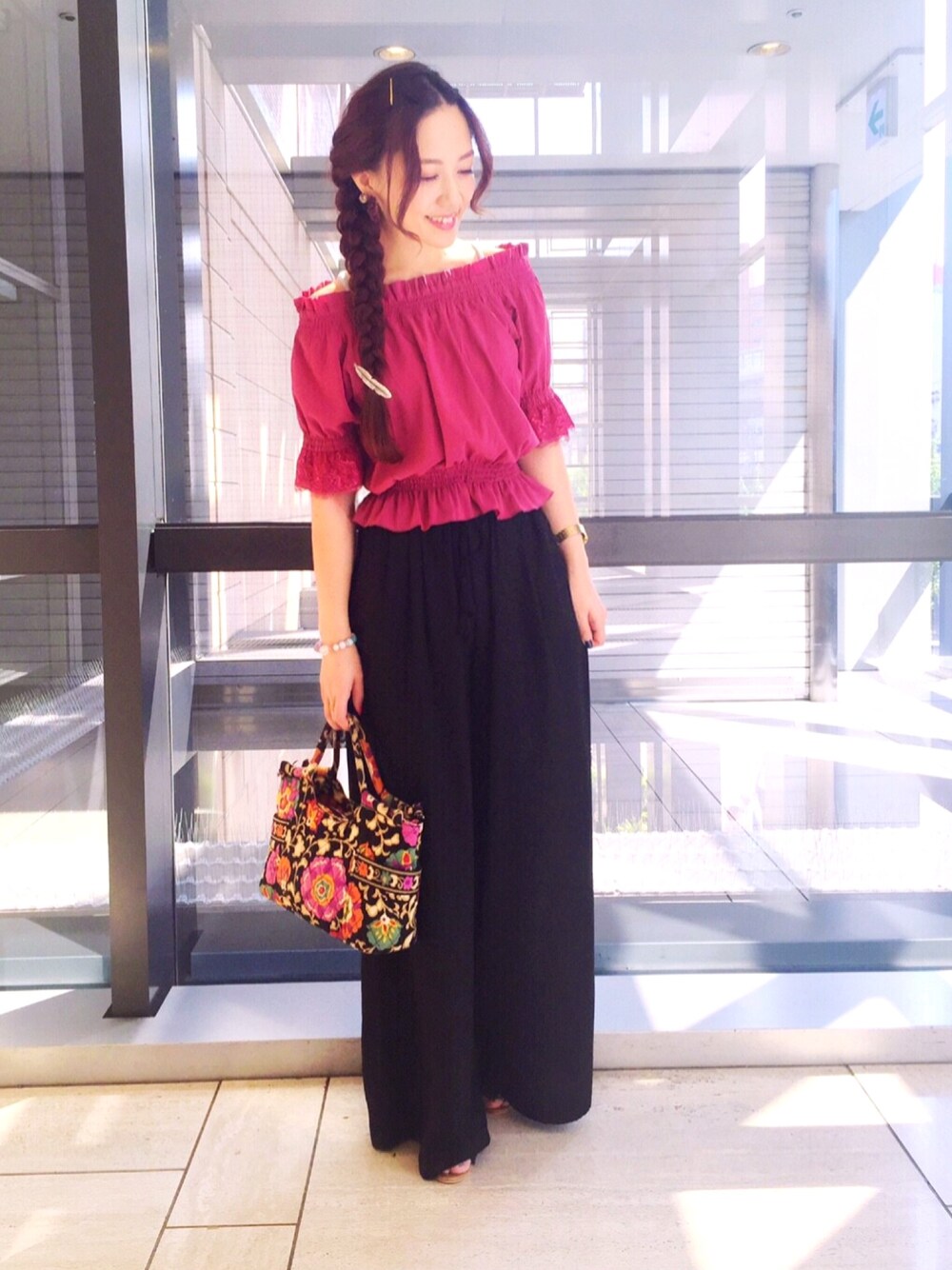 今日は、前にやったことあるコーデだけど、お気に入りなので改めて🙆 くすんだピンク紫のオフショルトップスに、黒のワイドパンツ。 トップスは腰がキュッとなってるから コンパクトに見えて好きです🐤 足元はオリエンタルトラフィックのリボンサンダル🎀 そして今回は、ヘアアレンジの 詳細写真、残してみました😊🎗