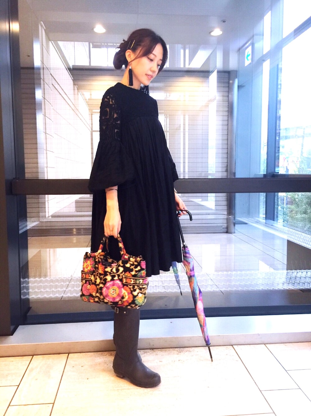 この日は雨がひどかったので 長靴で🙆☔️ ワンピースは数年前にH&Mで買った スカート部分にも袖にも布たっぷりの 真っ黒デザインワンピ。 胸元と腕はレースで、 首は詰襟で、かわいい💘 でも、夏着ると暑くて 冬は寒いから、今だ!と思って着ました😂笑 明日は何着ようかな🎽