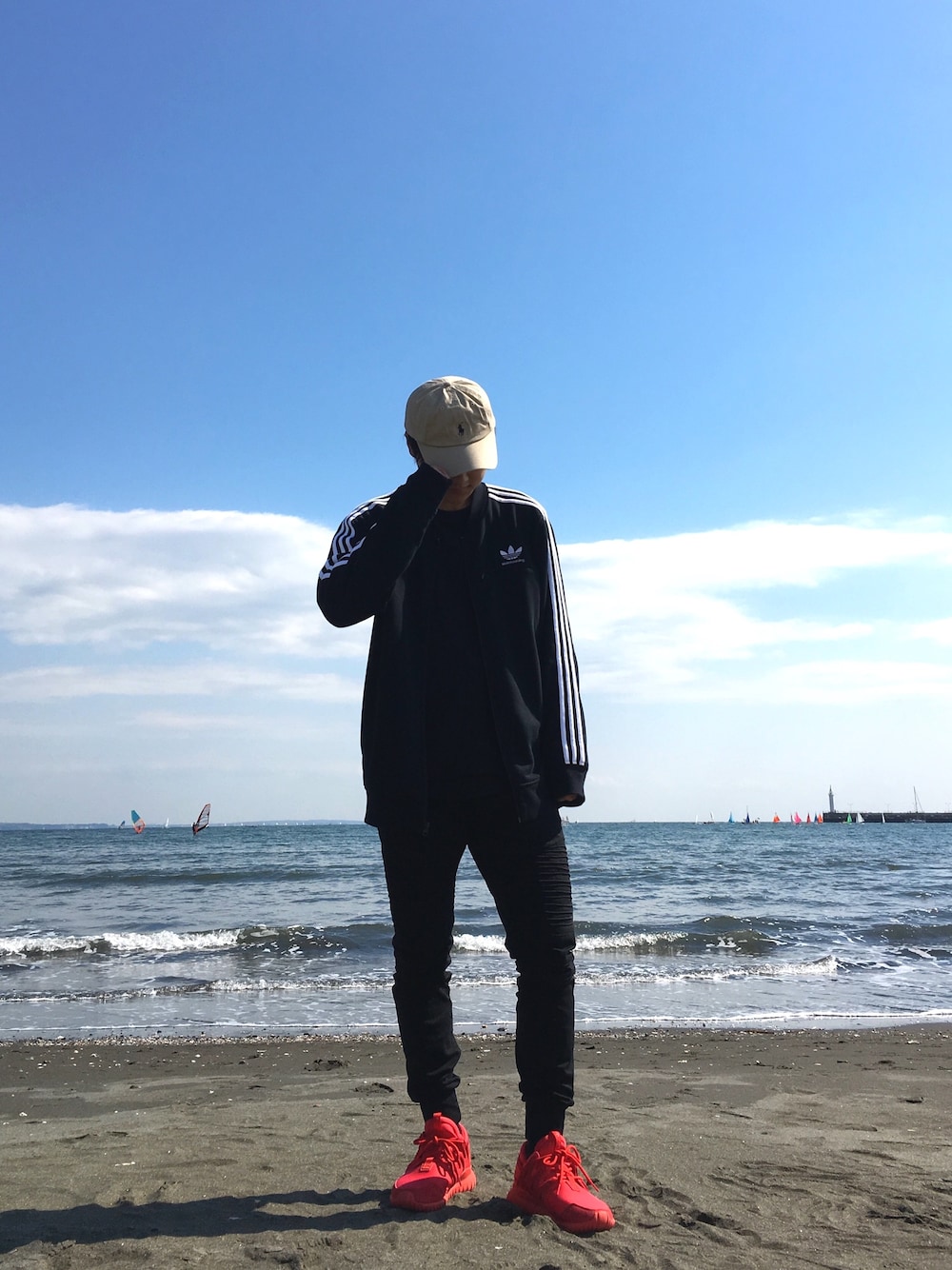この前江ノ島に行ってきた時のです🌊 チューブラーが赤なので他は暗めでコーディネートしてみました🙌