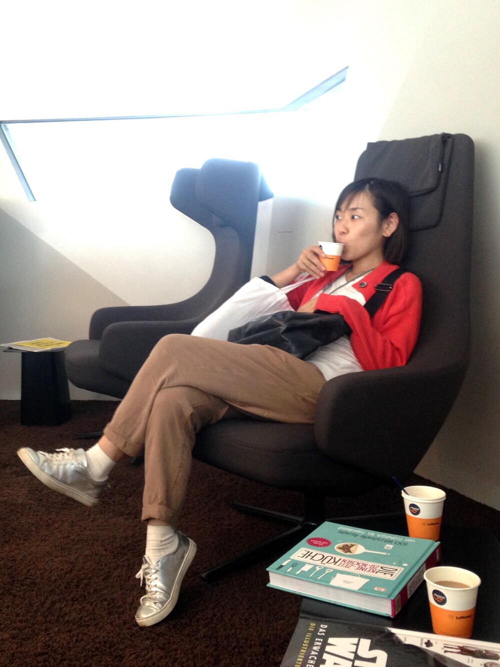 出張の乗り換え。ミュンヘンの空港で大好きなvitraの家具でくつろぐ。ドイツ大好き。ミュンヘンの空港はコーヒー類が飲み放題なんです!