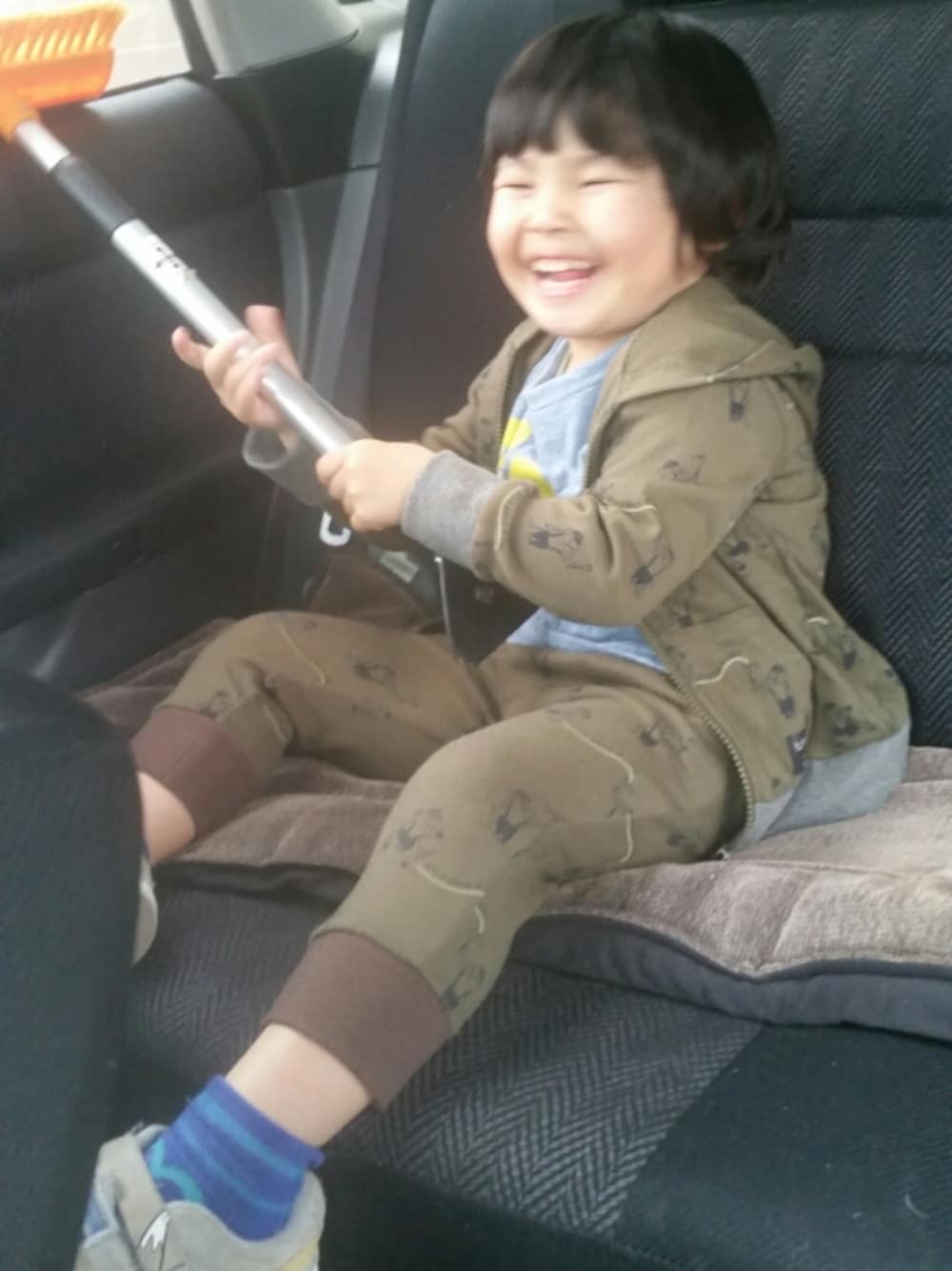 車内で見つけた車用の雪かきする棒を見つけてものすごい喜んでいる息子さん← 何がそんなに楽しいんだ(笑) でも、楽しそうで何よりだよ、母は。