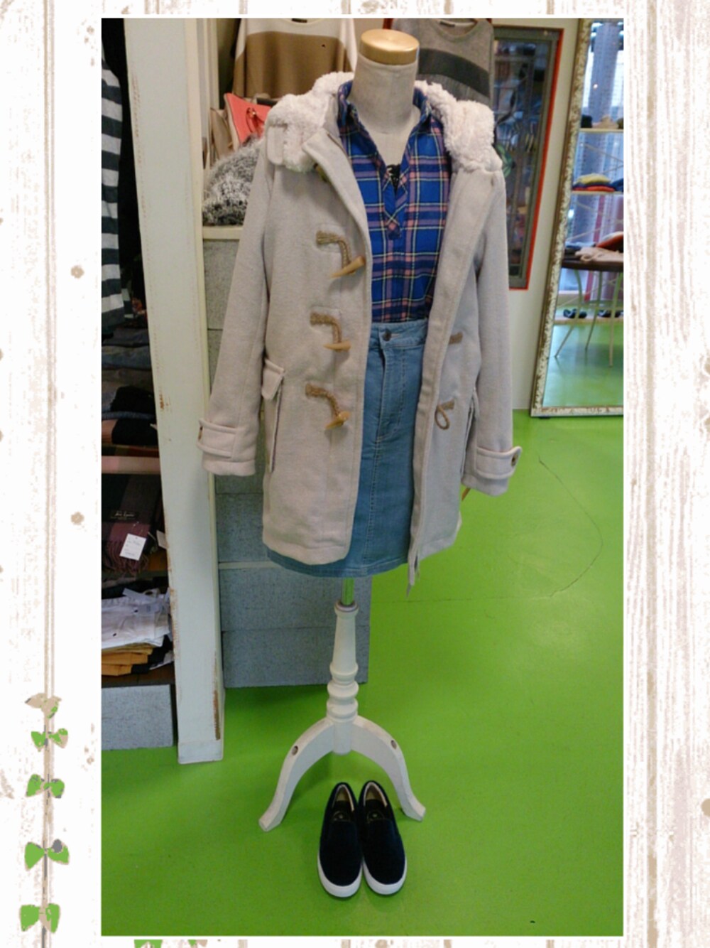 新作のダッフルコートをメインにコーデしました~(*´∀`)♪ チェックシャツとデニムスカートでカジュアルに(^^)