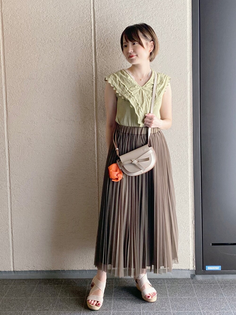 また暑くなっちゃったから夏の格好🌻でもカラーは秋っぽく🍠木みたいになっちゃった笑🌳 重めの色だけど、素材の軽やかさで、PCが淡いカラーの人や、曲線多めの人でも似合わせやすいアイテムです🎀