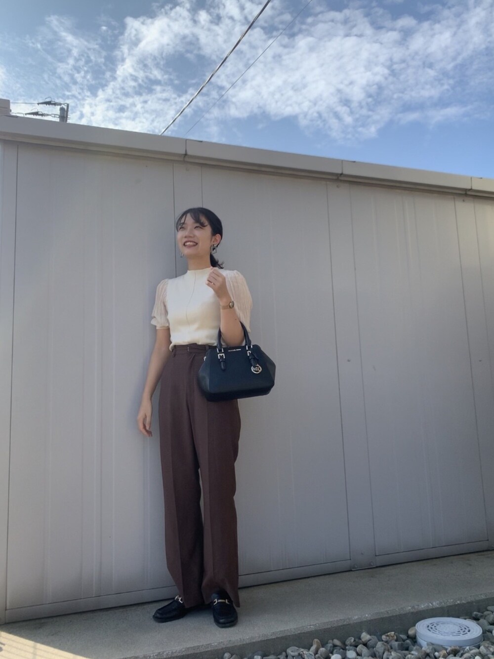 snidelの袖がプリーツになってて可愛いトップス と moussyの形がめちゃめちゃ綺麗なフレアパンツ と LOWRYS FARMのスクエアのローファー 全部お気に入りです🥀