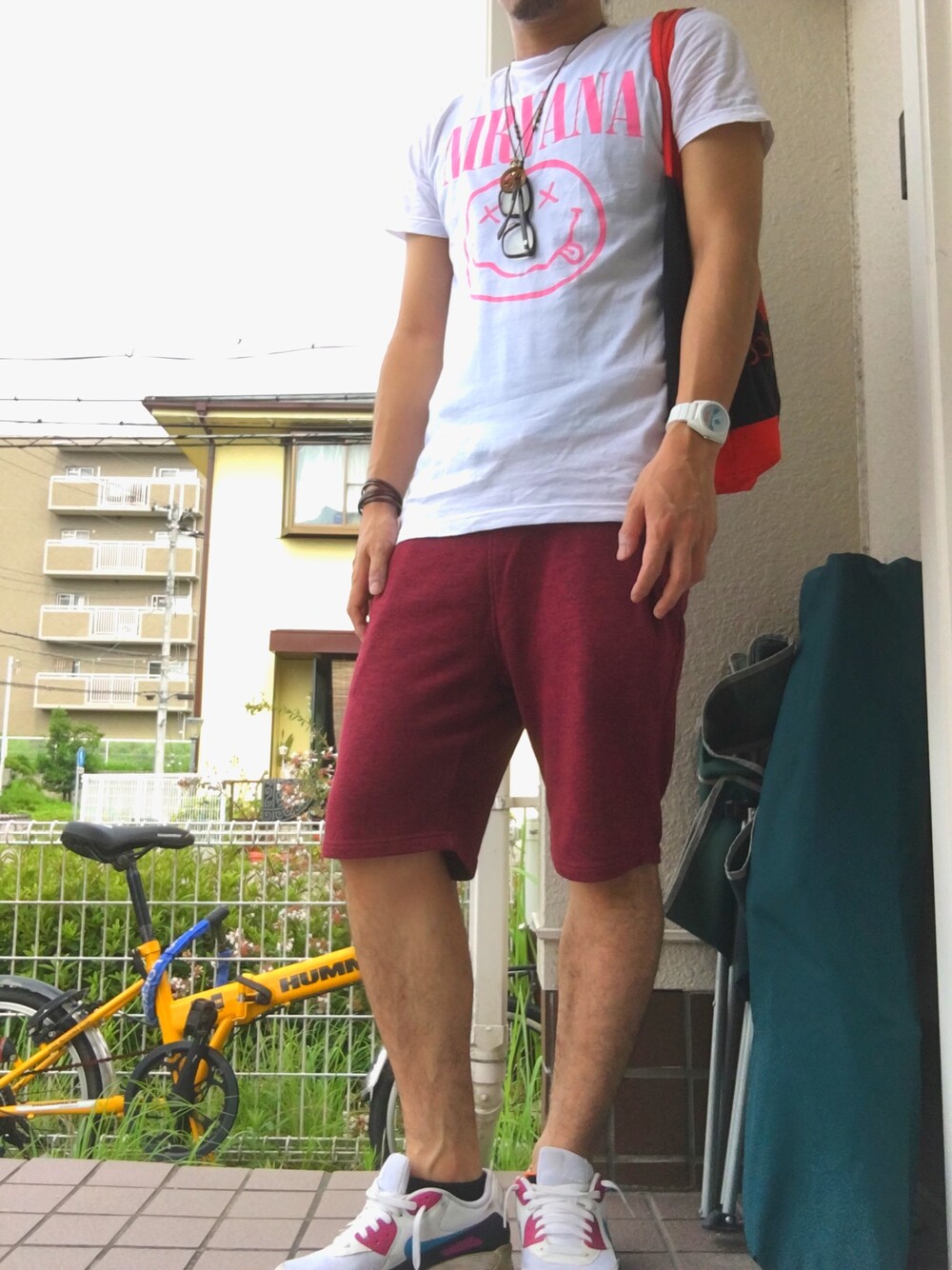 ピンク系のスニーカー、ホワイト系のアナログ腕時計を着用したメンズの夏コーディネートの1枚目の写真