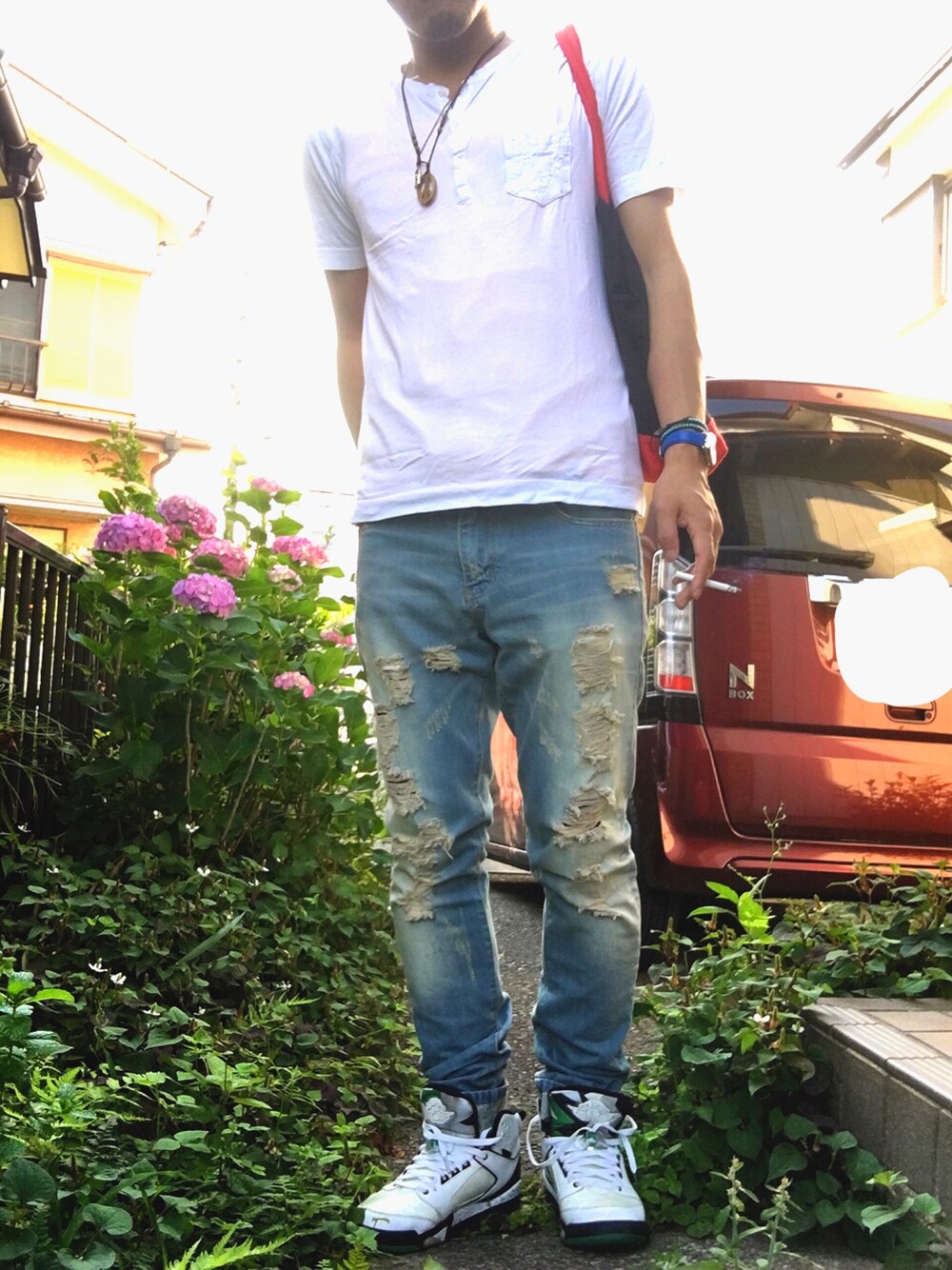 飲みに行ってました(^^) ダメージデニムに白ポケTという鉄板すぎる組み合わせ。 夏はシンプルになりすぎて悩む💦