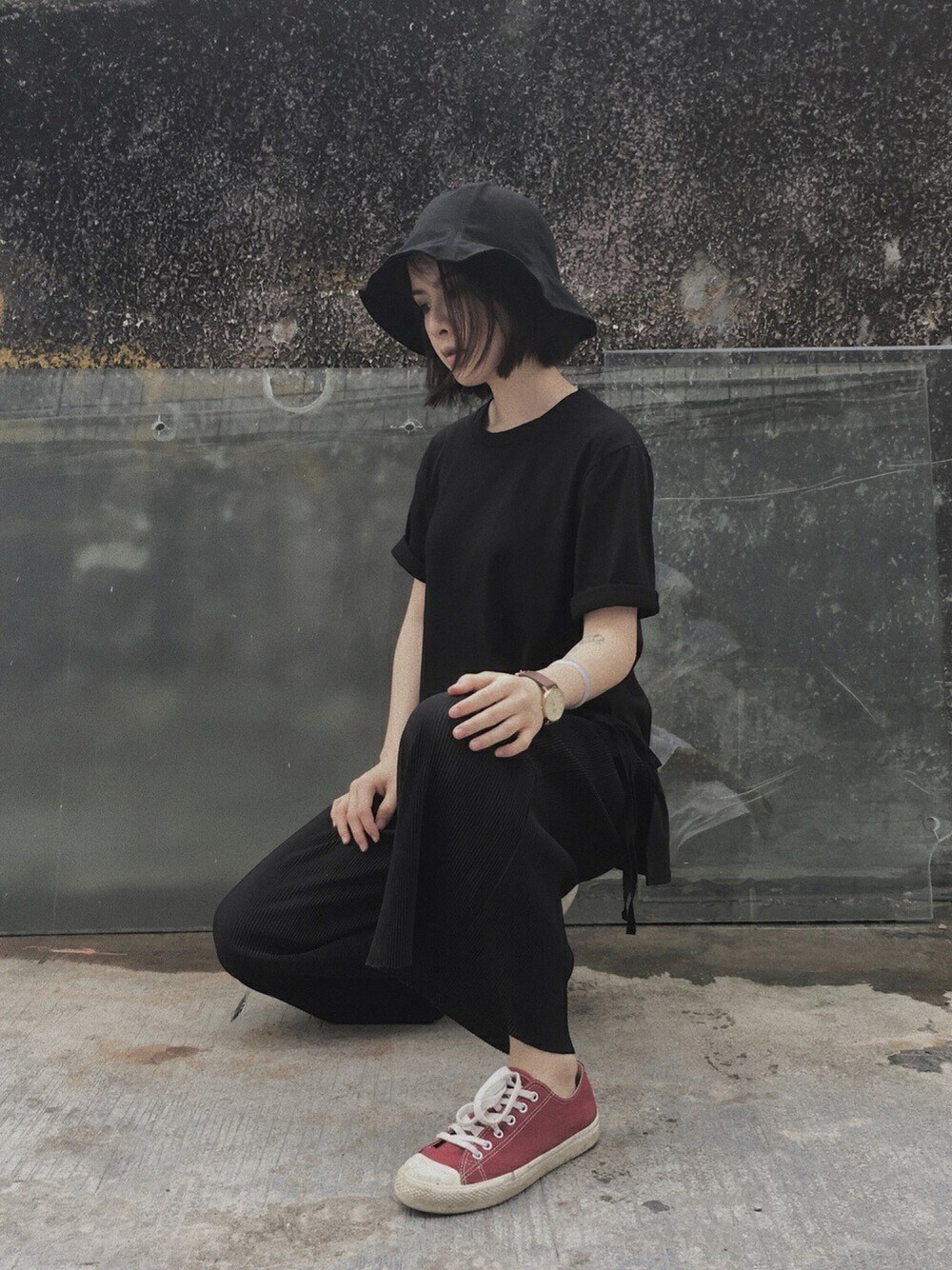 蹲姿练习// 虽然是全黑但其实上衣是有不规则+侧面高腰镂空剪裁+绑带设计啦🤧裤子是百褶的