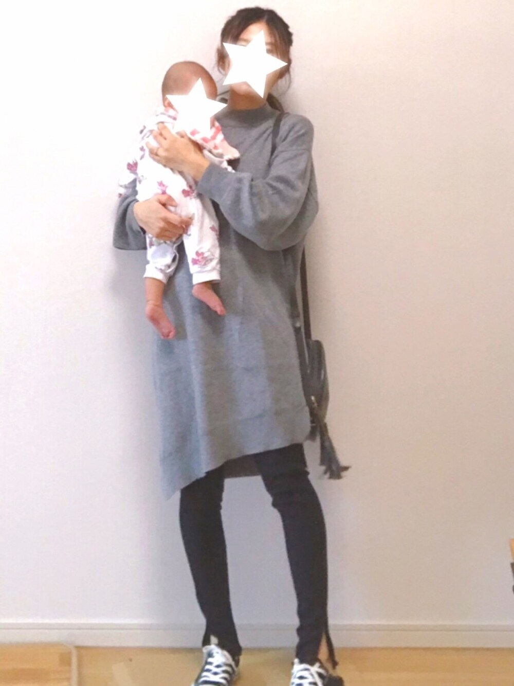 楽チンなニットワンピはアシンメトリーな裾が可愛い♡ レギンスはzozotownのタイムセールで90%オフでゲット出来た✳︎ 娘の服はピグレット柄♡