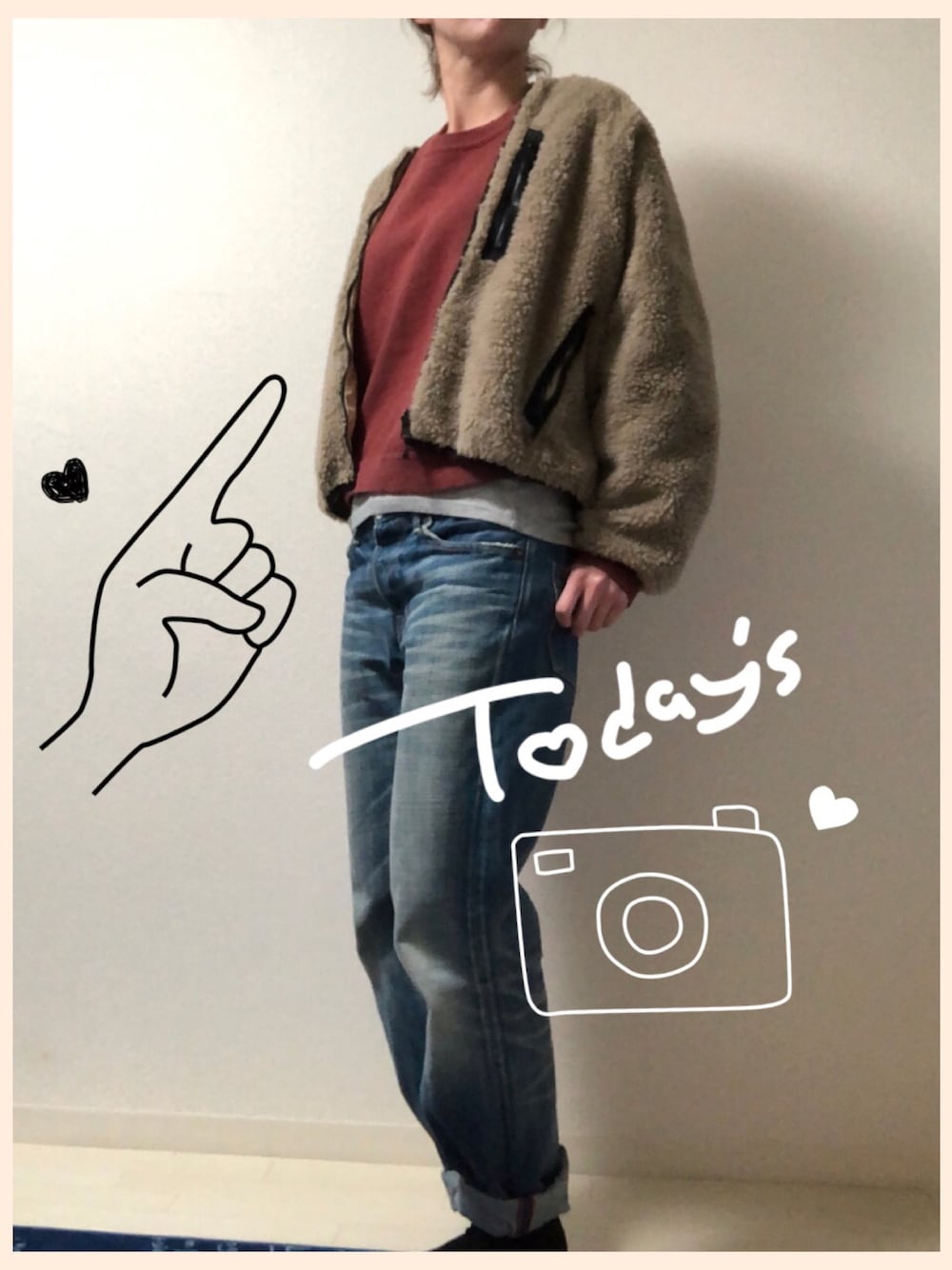 色を迷いに迷って 購入したボアブルゾン✨ 私の身長でも、モフッとしたまぁるいラインが出る 笑☺︎ デニムはもう6.7年育ててるやつ。オレンジ🍊のステッチがたまらなく好き💕