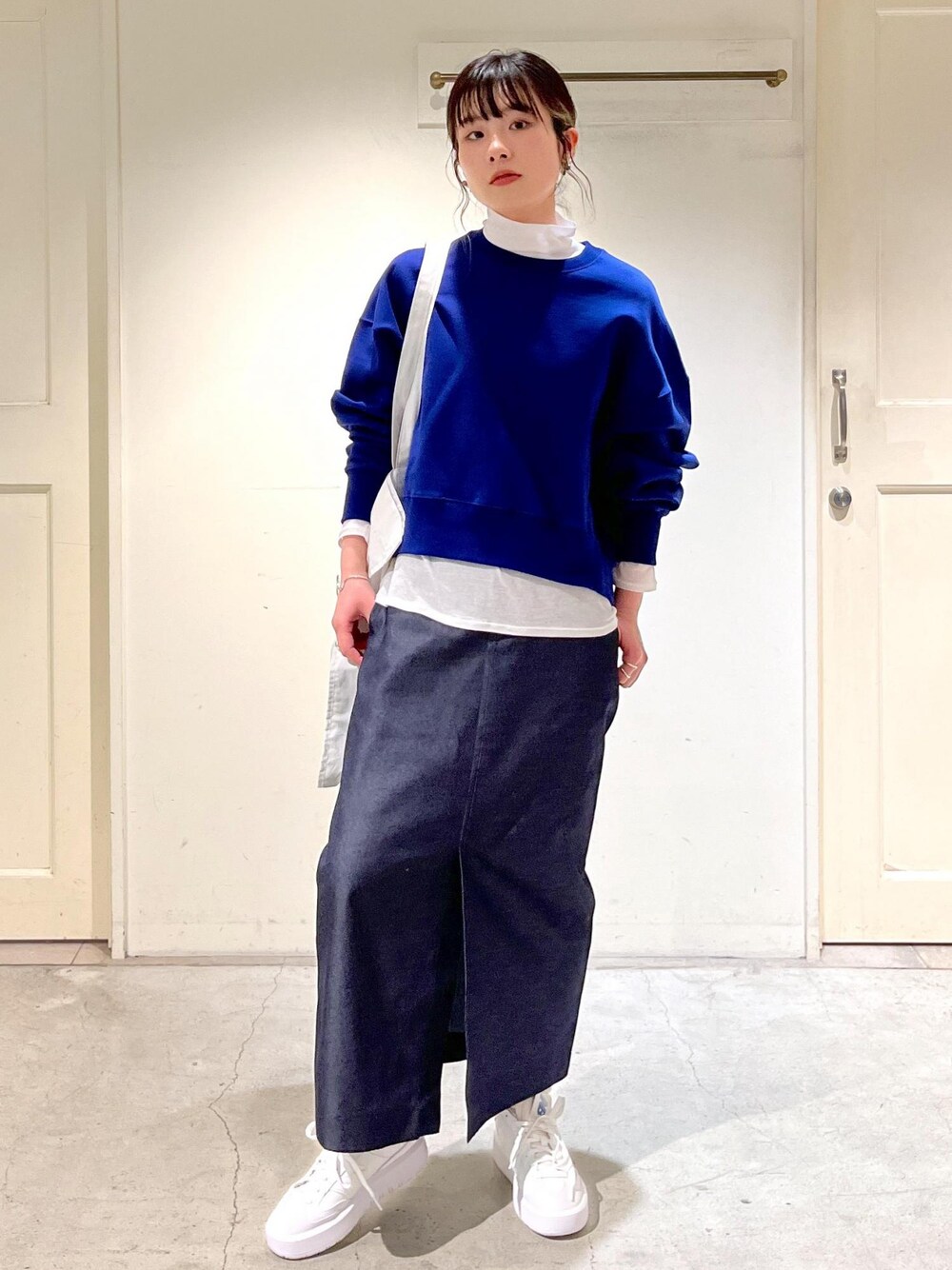 トップス: フリーサイズ インナー: フリーサイズ スカート: Sサイズ シューズ: 24.5cm 靴下、アクセサリー: 私物 SALONの定番スタイルアップパンツから スカートverが登場です! ハイウエストでタイトなので とても綺麗見えするシルエットです♡ 今回はデニム風スカートをスウェット合わせで カジュアルな雰囲気に。 足元スニーカー合わせでも女性らしくまとまります!
