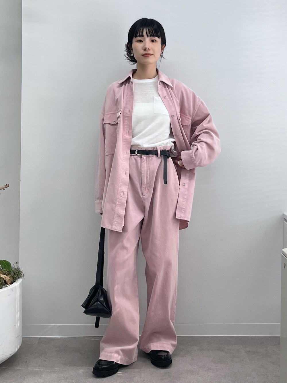 ヴィンテージ感あるコーデュロイ素材で ピックのセットアップですがモードな印象に。 小物がブラックのレザーで統一し、 かっこいい女性をイメージしました◎ 全体的にダボっとしたシルエットですが、 中のインナーになるとコンパクトなので 腰回りのメリハリがあって足長に見えます!