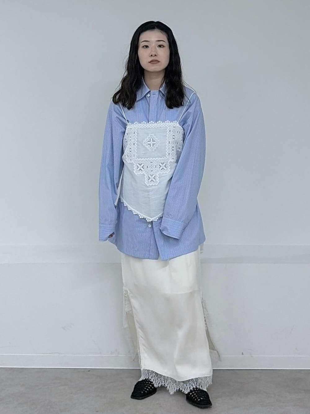 Americanaの新コレクションアイテム、 シャツジャケットをメインに爽やかコーデ。 ハリのある素材でダブルジップデザインの シャツジャケットはとても珍しい気がします! 2種類のレースを組み合わせて、 少し女性らしく、春らしくまとめました。