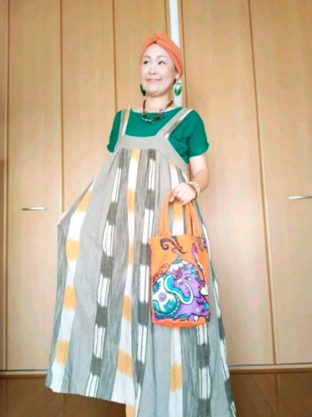 お気に入りのインド綿のサロペット✨ ターバンやアクセサリーでエスニック感満載に💓 好きな服を着ると元気になる💪