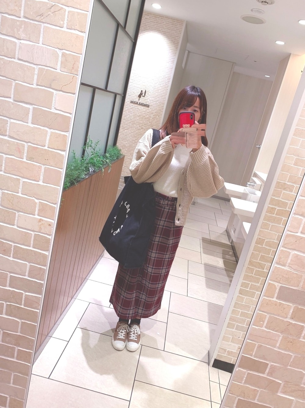 ベージュと赤チェックでまとめてみましたˆˆ♡ バッグの中にはお友達の誕生日プレゼントが入っているため大きめバッグ🤫💞