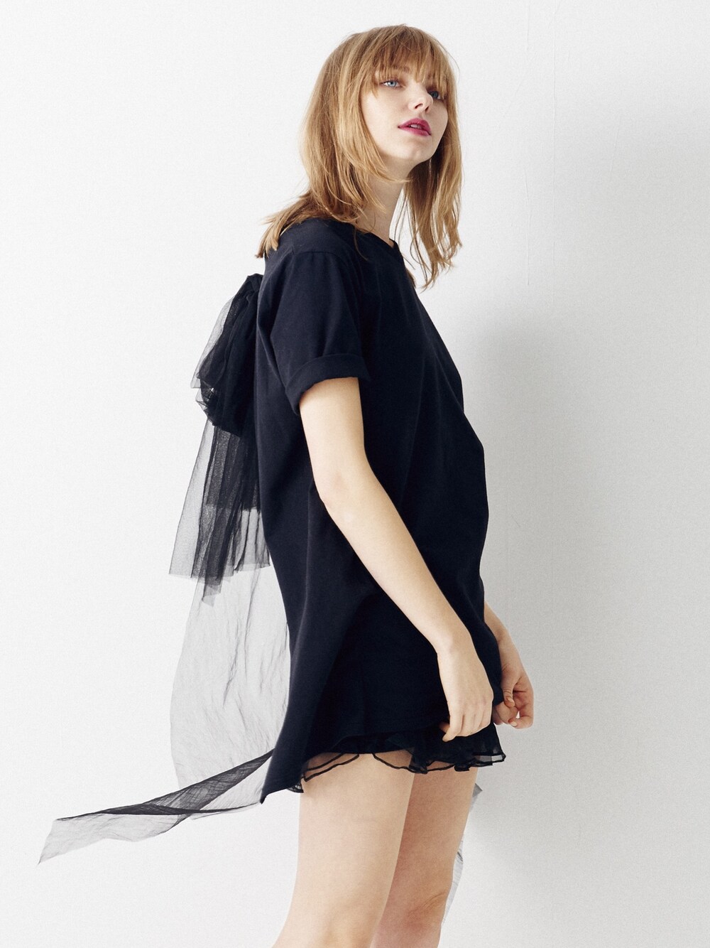 バックチュールリボンのTワンピ。 シンプルなフロントに、甘いバックスタイルがポイントです。