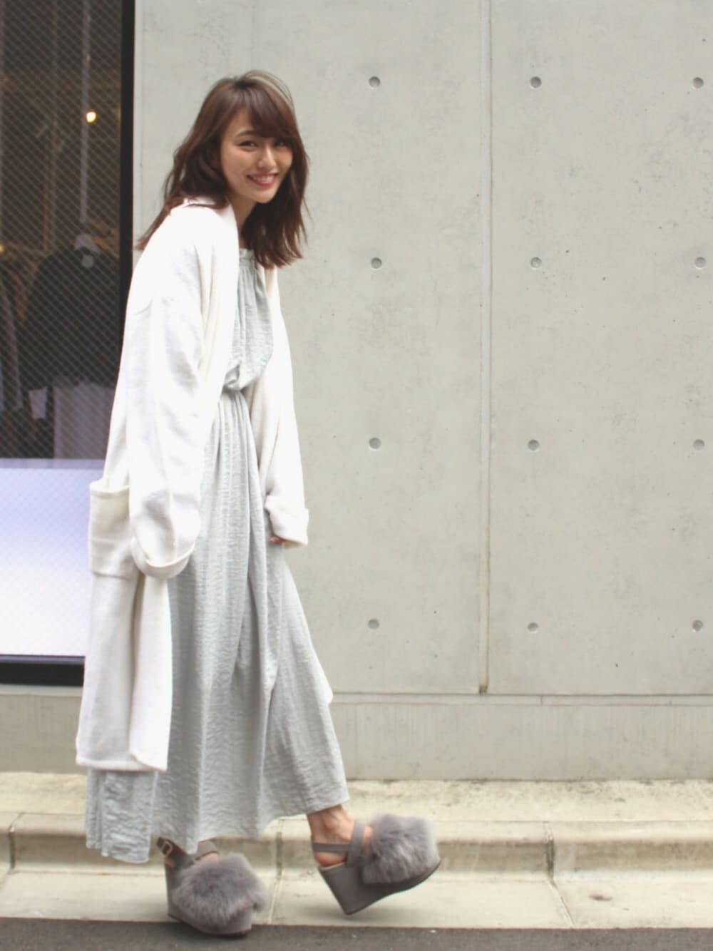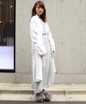 MICOAMERI 16AWcollection ライトグレーのロングワンピース×ホワイトのコーディガンで柔らかなオトナゆるっとスタイル。