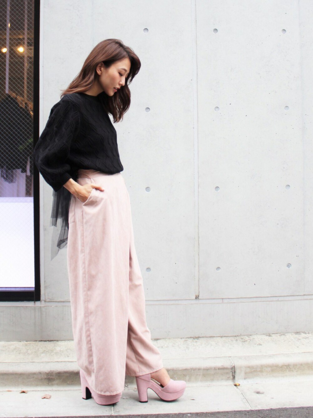 MICOAMERI 16AWcollection 立体感のある編み地のバックチュールニットのブラックには、ピンクのワイドパンツを合わせて、オトナなsweetスタイルに。