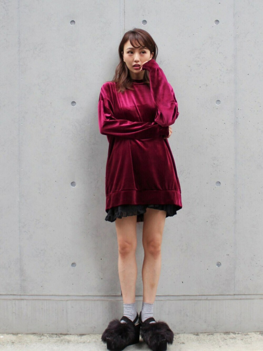 MICOAMERI 16AWcollection MICOAMERI×Silent Sirenコラボアイテム。 ベロア素材のビックシルエットスウェットに、コンパクトボトムと合わせてワンピ風にスタイリング。