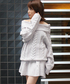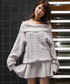 MICOAMERI 16AW collection ケーブルニットのセットアップスタイル。 落ち着いたライトグレーのニットは、袖にボリュームを出し、女性らしい華奢な印象になるように、全体をゆったりしたシルエットになっています。