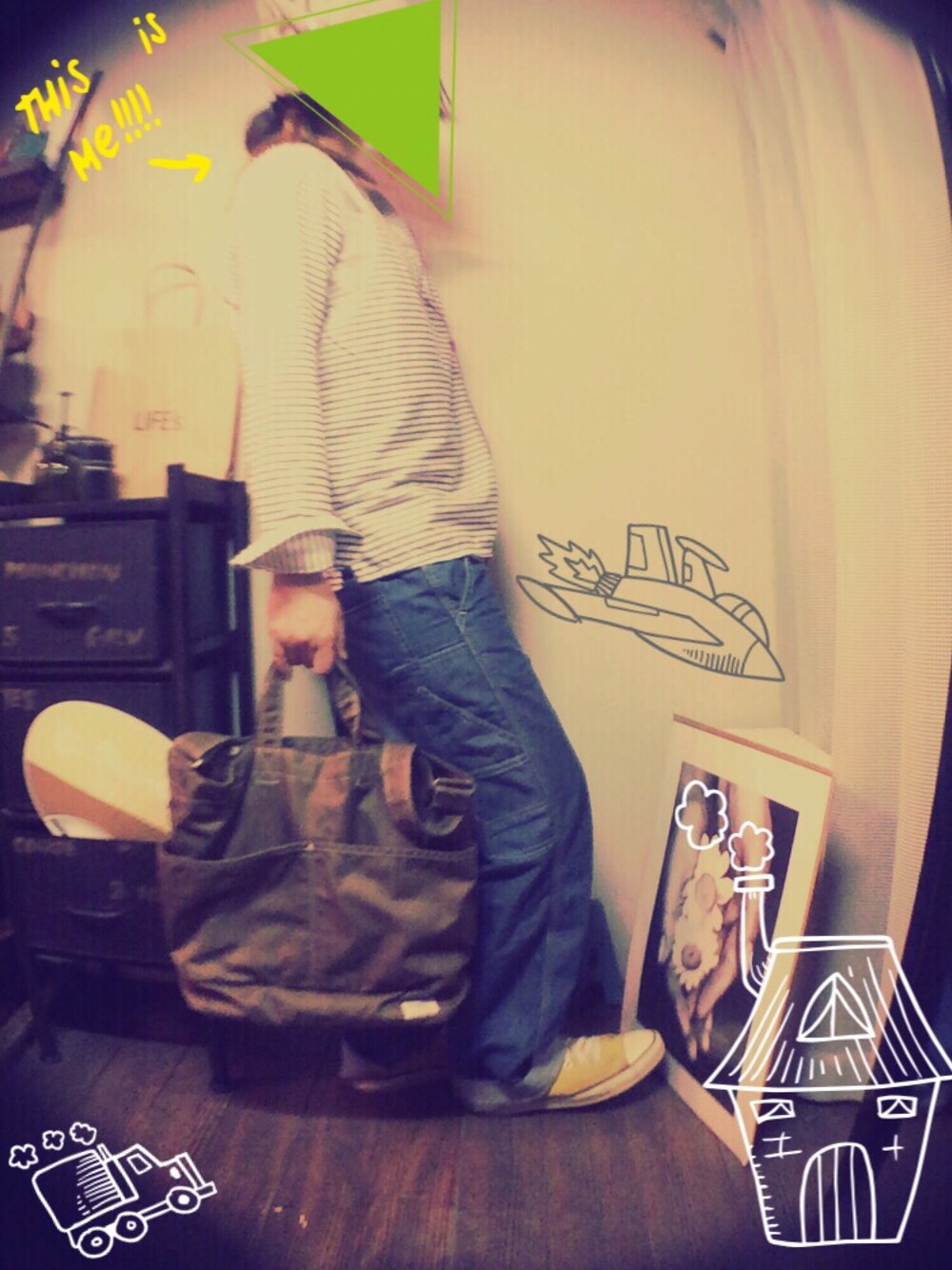 室内で靴はいてすみません。 全身写したいがために広角レンズ使ったら画像荒くなった。 しかもポージングとかわからんから不自然な格好。 カバンがお気に入り