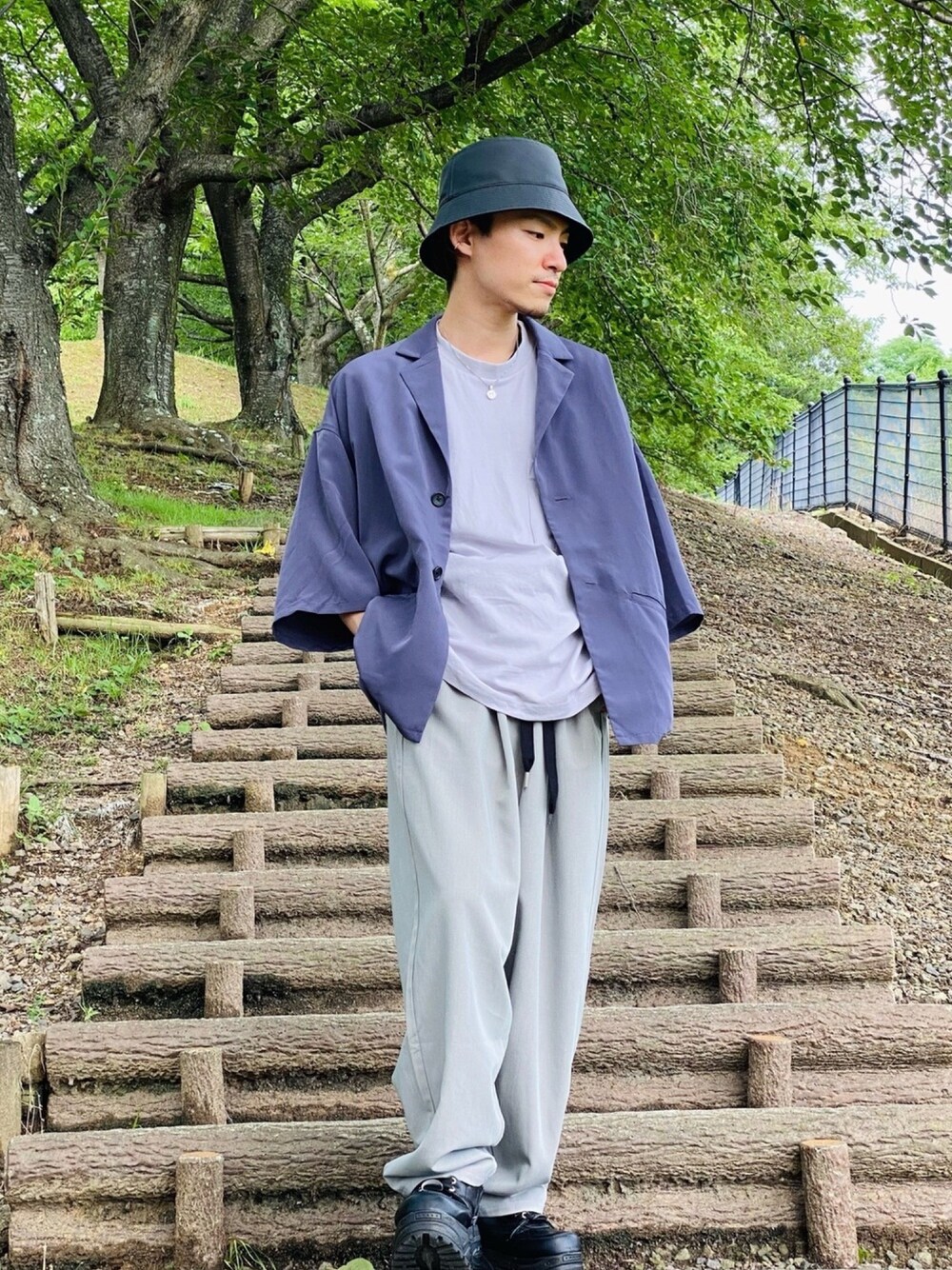 パープルをベースに黒、グレーでまとめたシンプルコーデです。 HAREのバケットハットはシンセティックレザーを使っていて、合わせるだけでコーディネートをモードにしてくれる着回し抜群のアイテムです! HAREのファイユシャツジャケットは光沢感のある生地ですが、くすみカラーで意外と合わせやすく使い勝手のいいアイテムです! Casper johnのハイテーパードハカマパンツはワイドシルエットで、ウエストコードもアクセントになり、タックインしてもオシャレに決まるアイテムです! 今後も低身長を生かした男女で着回せるコーディネートを投稿ドンドン投稿していくので、いいね、フォローいただけると励みになります! よろしくお願いします!