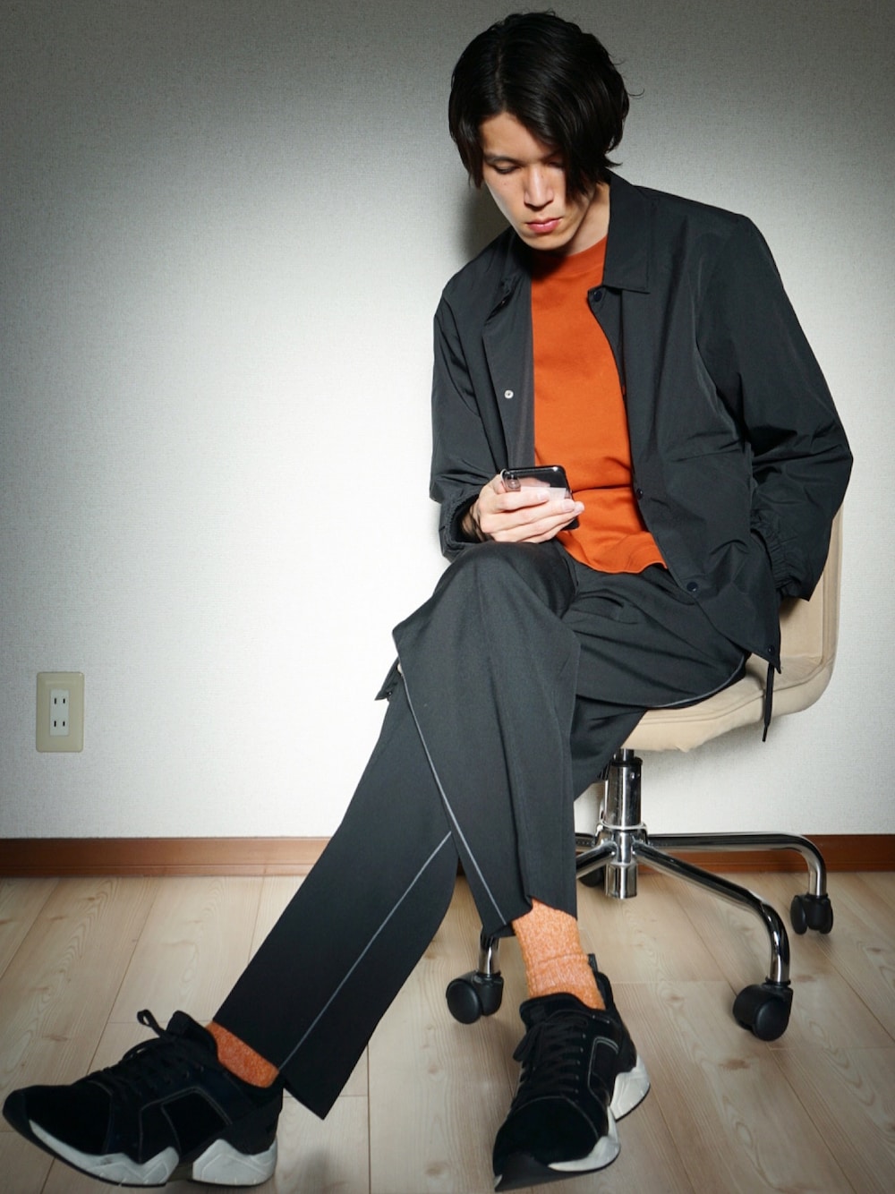 いつも「いいね」「お気に入り」「フォロー」をしてくださりありがとうございます🙇♂️ ーーーーーーーーーーーーーーーーーーー Instagramもやっておりますので、是非一度立ち寄ってください! Instagram → @masaki0505_jp ーーーーーーーーーーーーーーーーーーー この日のコーデはストリートライクな中にフォーマル感をちょい足ししたコーデです。 GUのコーチジャケットにエアリズムTシャツを合わせてます。 コーチジャケット自体はわりとカジュアルなのですがブラックを選んでサイズ感もジャストよりややオーバーくらいに抑えることで、カジュアル感を抑えてます。 そしてダークオレンジのエアリズムを差し色に使って春を取り入れました! エアリズムはTシャツなのに生地のツヤ感が素晴らしいので、カジュアルな印象が薄まります。 そこにワイドのブラックのスラックスを合わせてフォーマル感をちょい足しして、最後にスニーカーで外してます。 差し色のソックスもTシャツと色合わせしてるところもポイントです。