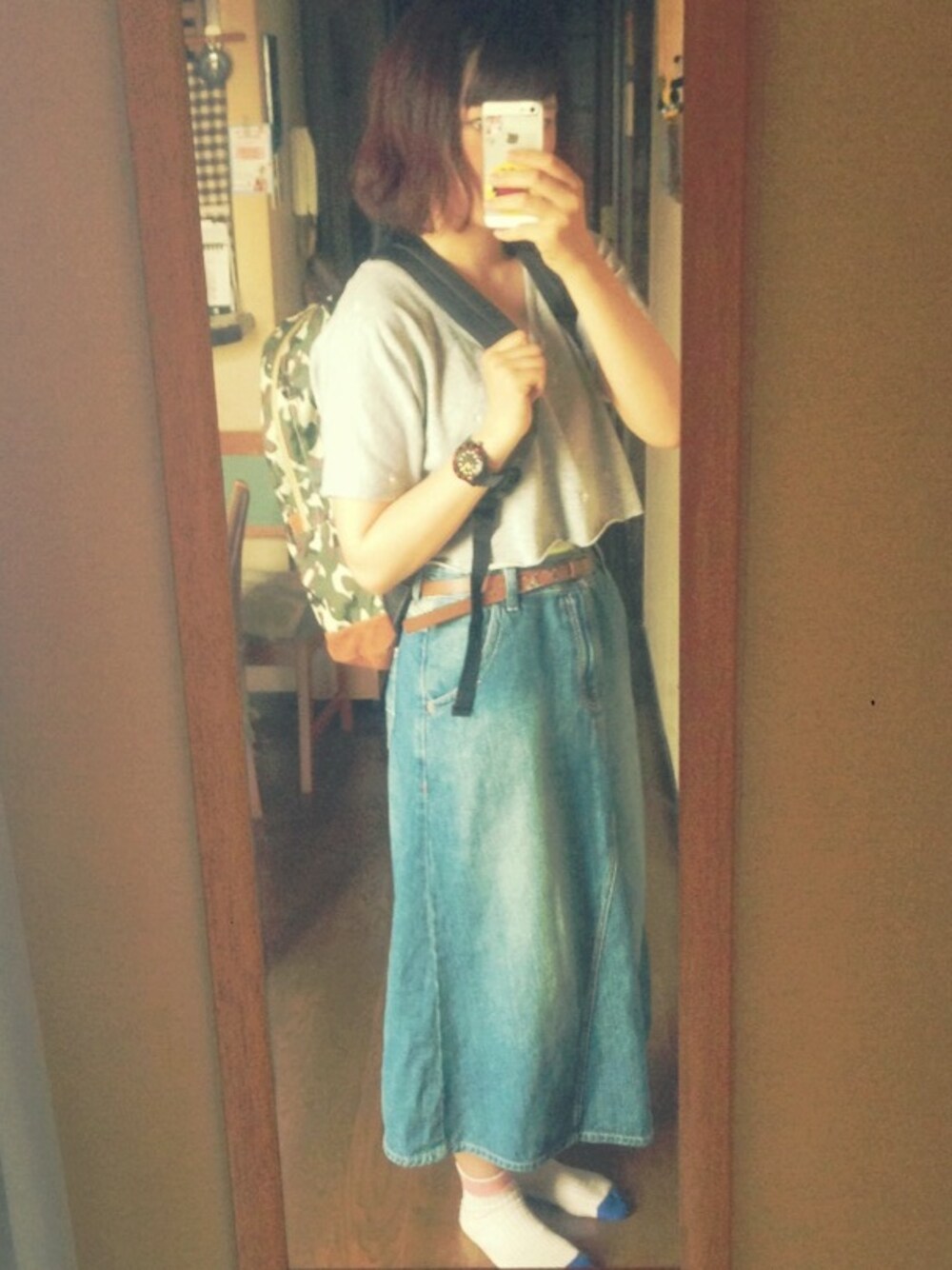 作りたての服でバランスコーデ( ∵ )♨ デニムロングスカート…ノーブランド 靴下…tutuanna リュック…bluebleuet