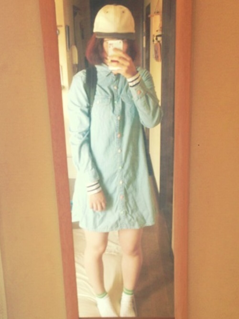 シャツワンピを一枚でシンプルに シャツワンピ…honeys(リメイク) ソックス…tutuanna リュック…bleubleuet