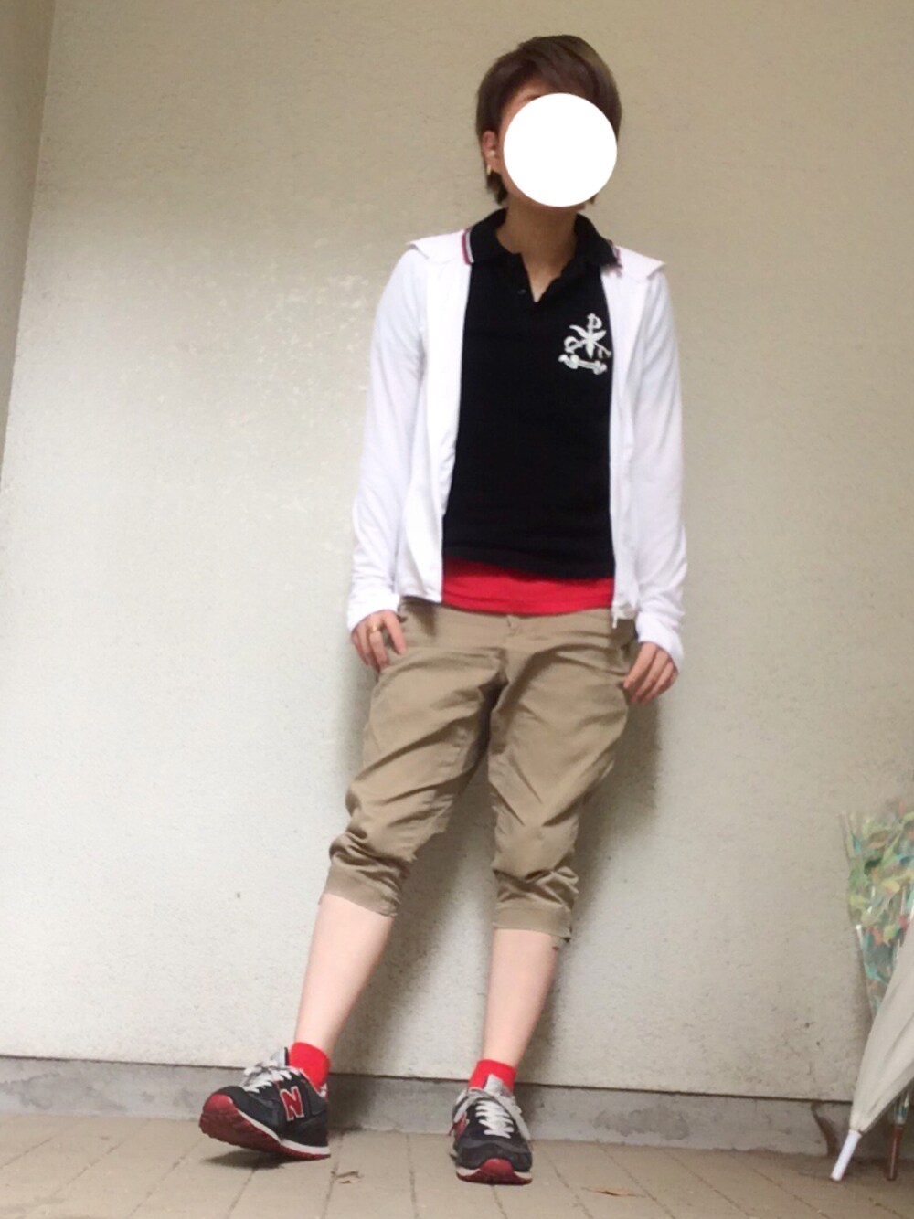 the pillowsのライブグッズポロシャツをベースにしたアクティブコーデ。UNIQLOのUVカットパーカーが対紫外線に心強い。