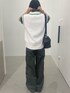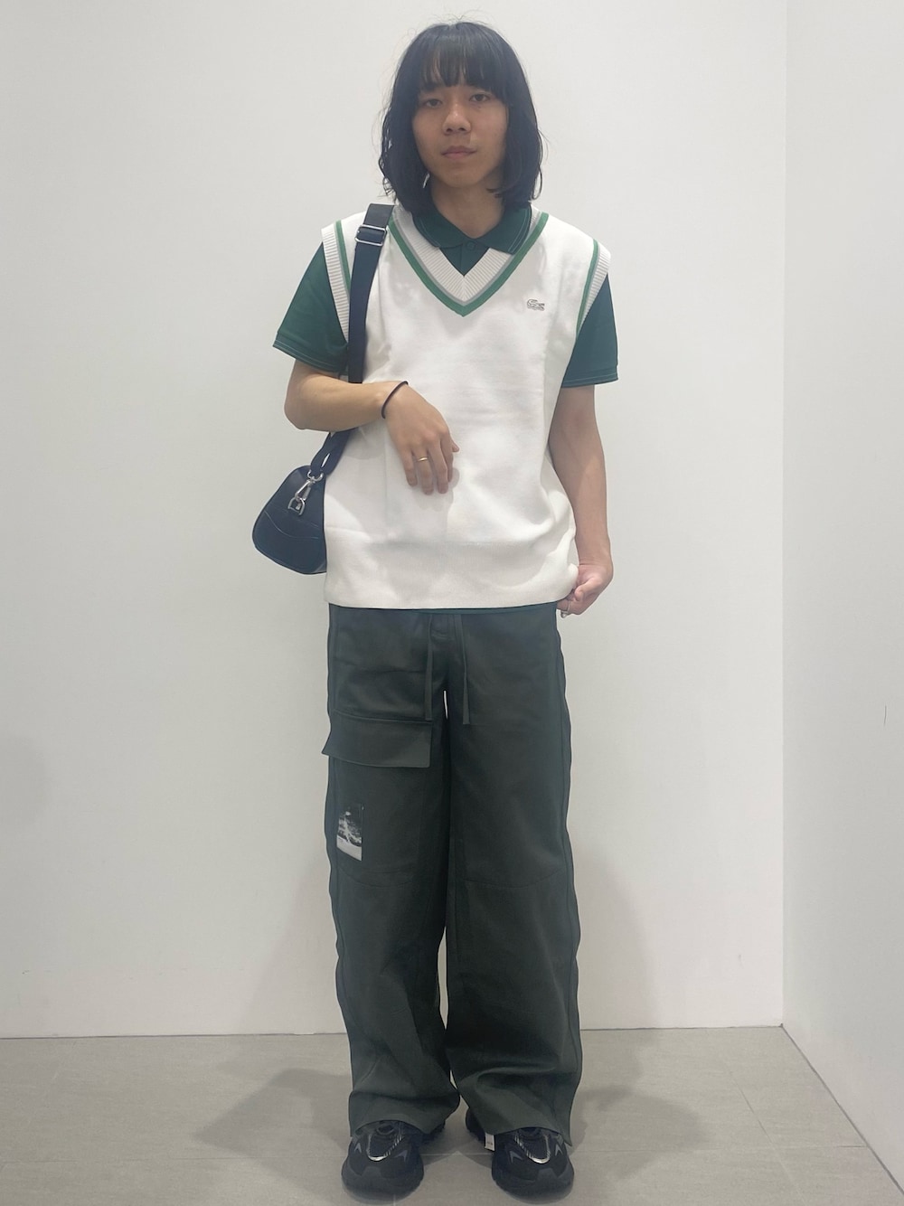 濃い緑色を基調に組んだスタイリング。 白ベストのおかげで全体的に重くなり過ぎないようになりました。 ポロシャツの襟と袖にあるステッチで色拾っているのもポイント。 パンツはサイドのボタンでシルエットが変わります。 スニーカーは今シーズンからの新作でクッション性に優れ、3mm浮いている気がします。 バッグはレディースの分類にはなるものの、可愛いのでメンズの皆様も使っていきましょう。