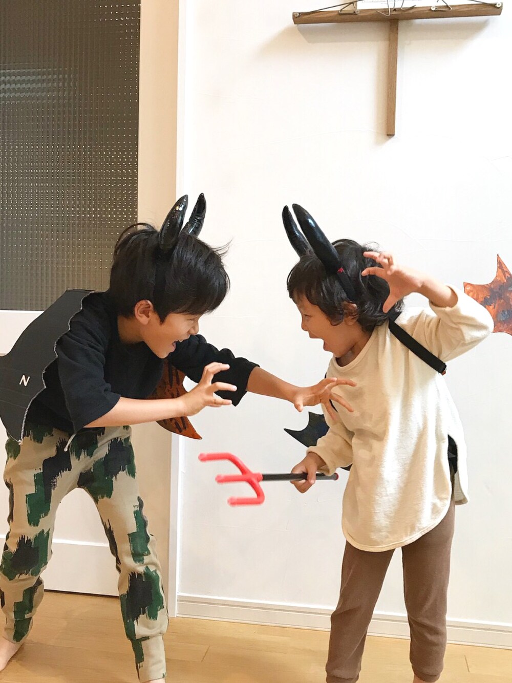Halloween 悪魔な2人⚔ 角は100均をアレンジ 羽根は子供達、絵の具で塗って自作 この時はつけ忘れたけどしっぽもあるよ♩