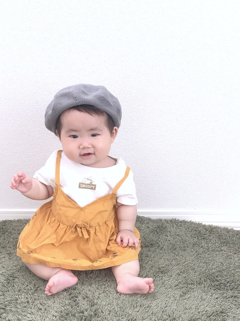 寝起きの顔で 目がむくむく(笑) ベビーザらスの スヌーピーロンパースセット♡