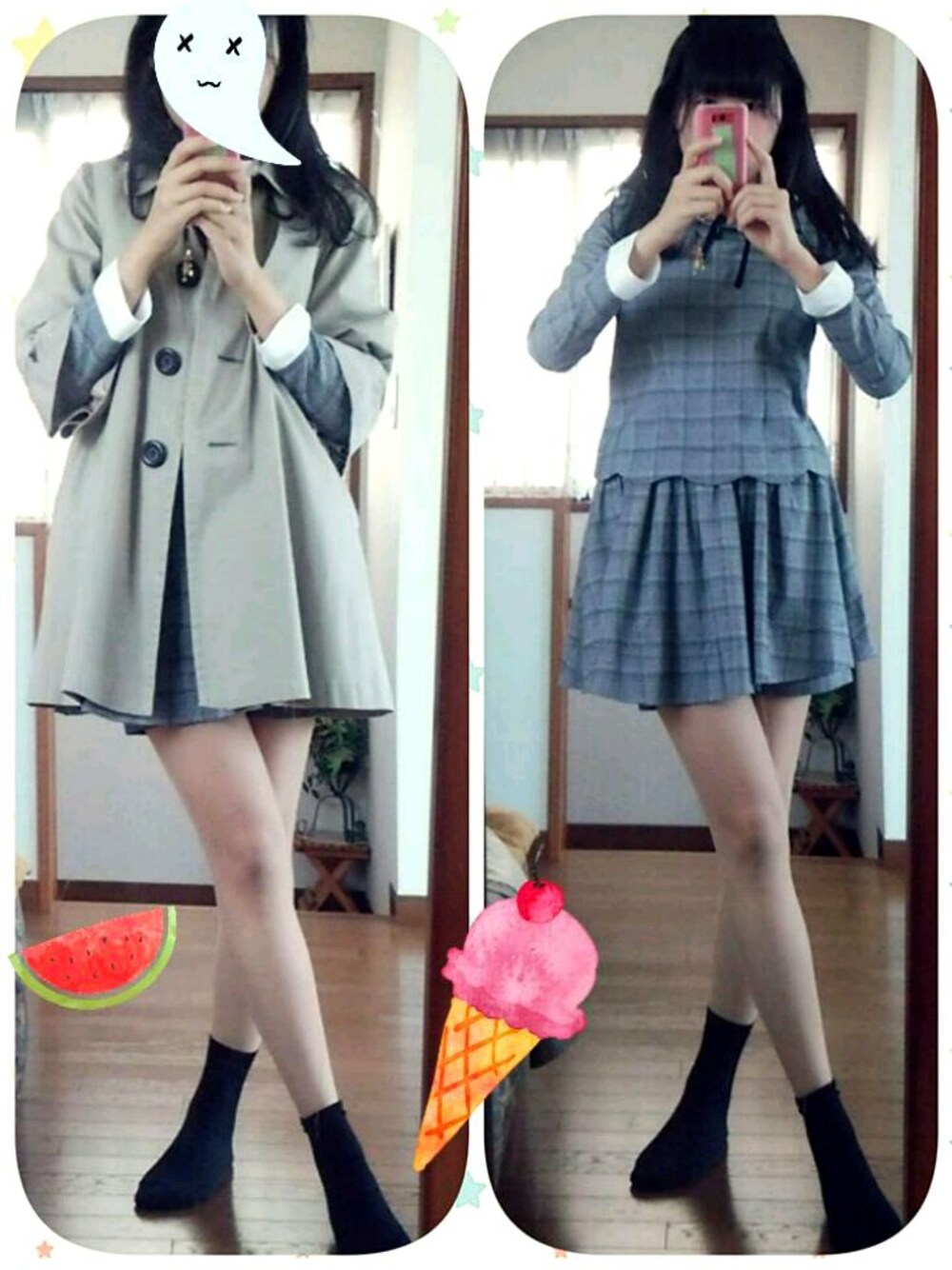 なぜか全く同じポーズをとっています... トレンチは、形がAラインで、七分丈。ちょっと珍しい感じでお気に入りです。 セットアップは丈が短くても中がパンツ?ズボンになっているので使いやすいです。