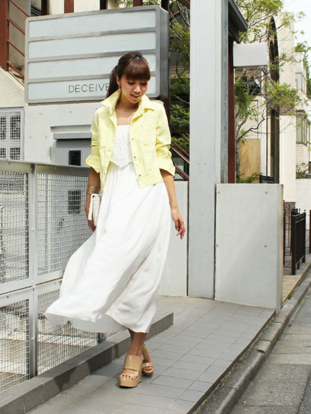 夏になると着たくなる、ベアマキシワンピース。 さりげないデコルテ部分のレースがポイントです。 アジャスター付きのストラップは取り外しができるので、キャミソールでも、ベアでもお好みで着ていただけます。 トレンドのイエローで、華やかな印象に!