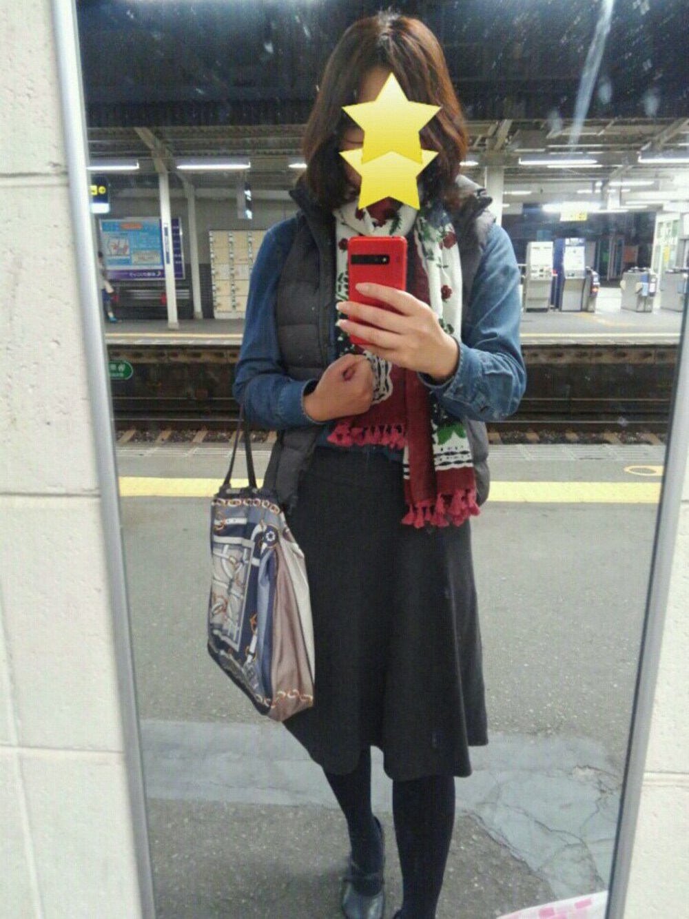 デニムシャツにダウンベスト。ボトムスはミディ丈のフレアスカートで。