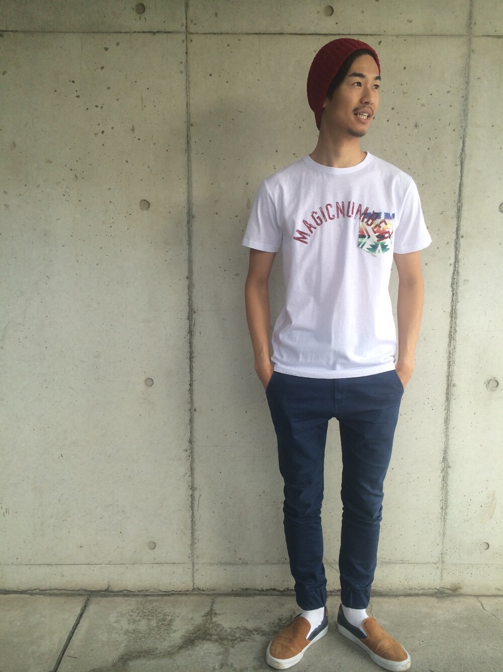 ポケットTEEにアーチロゴをプリントするひと手間かけた拘りのあるMAGICNUMBERのTEEシャツ。TEEシャツにしっかり存在感があるためビーニーなど小物を一つ取り入れシンプルスタイルがクール。