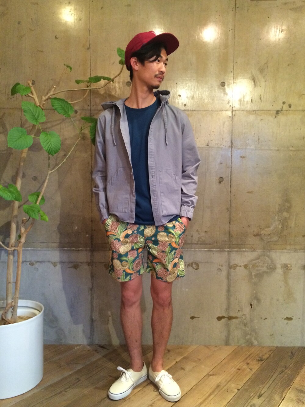 今季のオリジナルパターンであるペイズリーショーツをアクセントに、落ち着いたカラーでまとめたシンプルなコーディネート。 全体的に濃いめのカラーなので、重くならないようシューズは白を合わせ爽やかさもプラス。