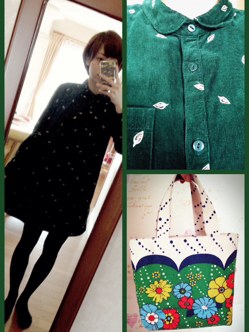 コーデュロイシャツワンピ! もう暖かくなって着れなくなりそう。 みどりのワンピースに合わせて みどりの小さいバッグ。