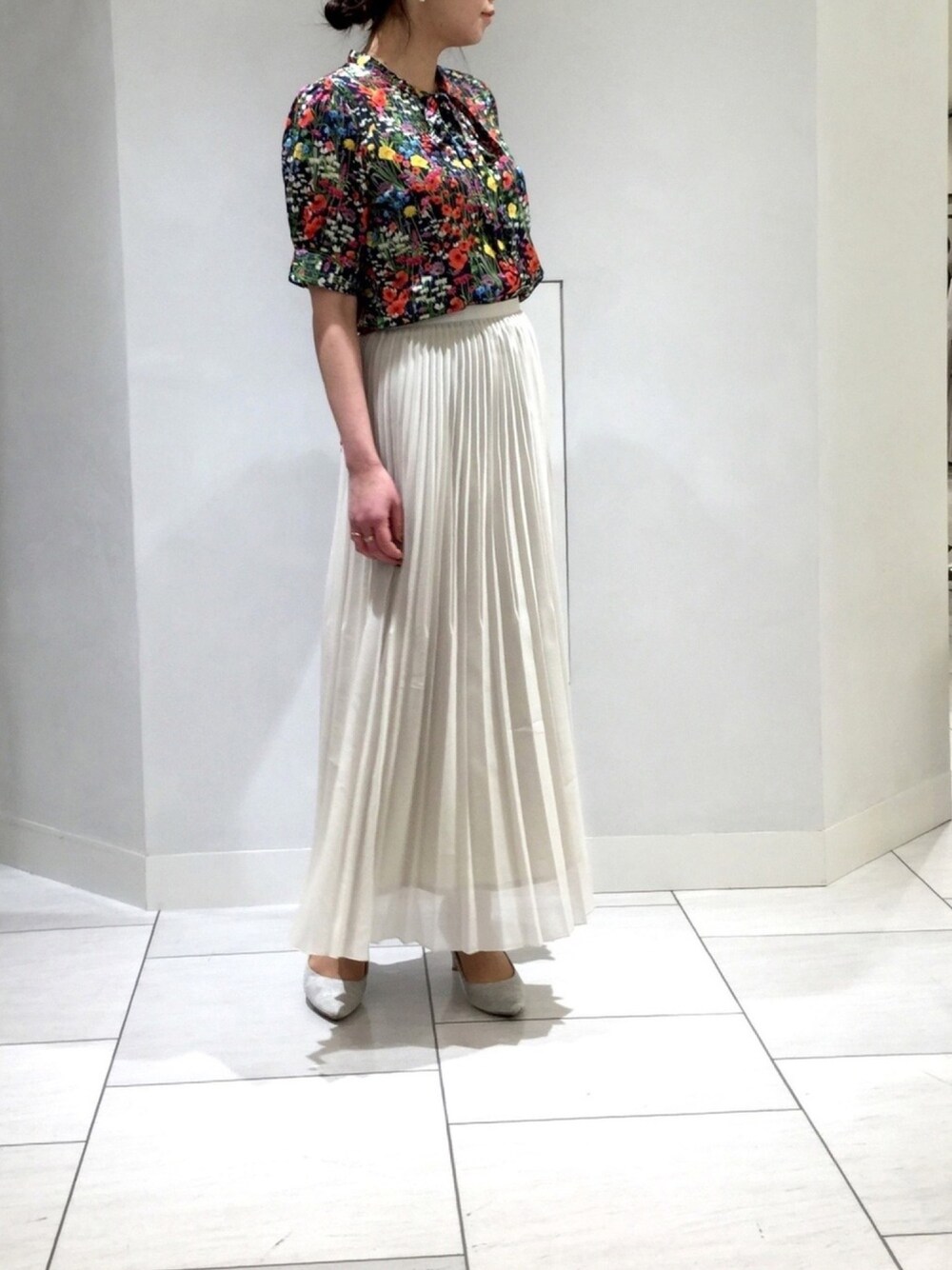 BL 10-11-04-223 1サイズ SK 30-11-08-507 1サイズ ネイビーベースにカラフルなフラワープリントのブラウスは、首元に細めボウタイリボンが付いていて、袖は少し長めの半袖です。 柔らかいカラーでまとめるのも春らしくていいですが、ボトムスとのメリハリをつけたカラーコーディネイトもスッキリ見えでオススメです。