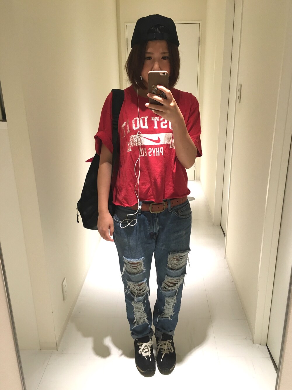 ステューシーのキャップは 後ろ向き(^^) スピンズのトップスとパンツは 古着でゆるゆる(^^)