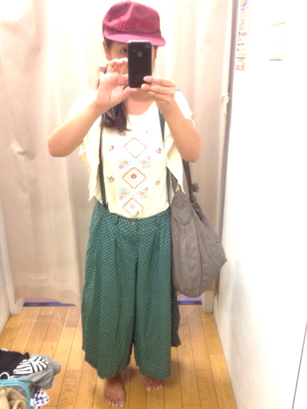 古着屋さんの試着。このガウチョに何でこのトップス合わせたんだろう😅無難に無地にすれば良かったかなー💦