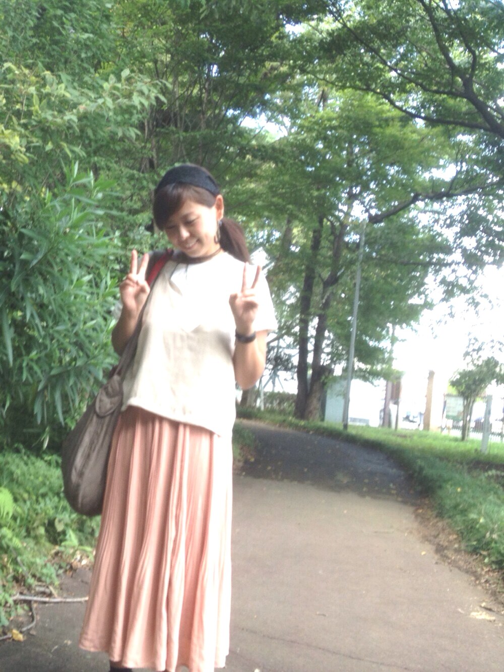 息子が撮ってくれました📷in グリムの森。蚊にたくさんさされましたが、森林いっぱいで癒される💗ピンク&ベージュで、たまには女の子らしいコーデに😻