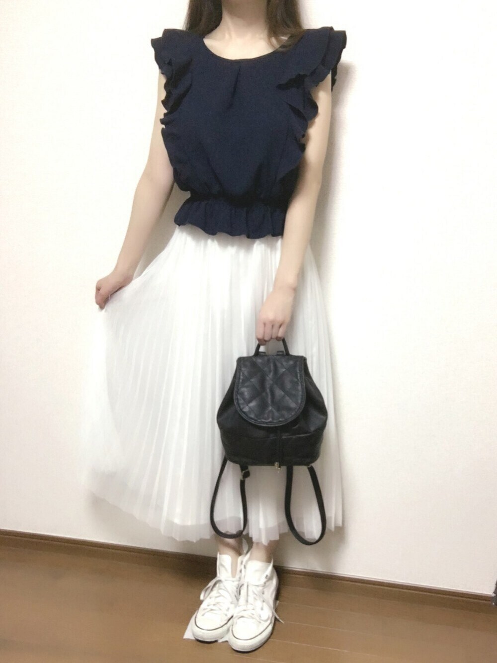 更新していなかった日のコーデ😆 スニーカーとリュックで楽ちんコーデ✨ 手ぶらで歩けるのって本当に楽ですね🎵 フリルが好きすぎて、ついついフリルのトップスやワンピースを集めてしまう😂