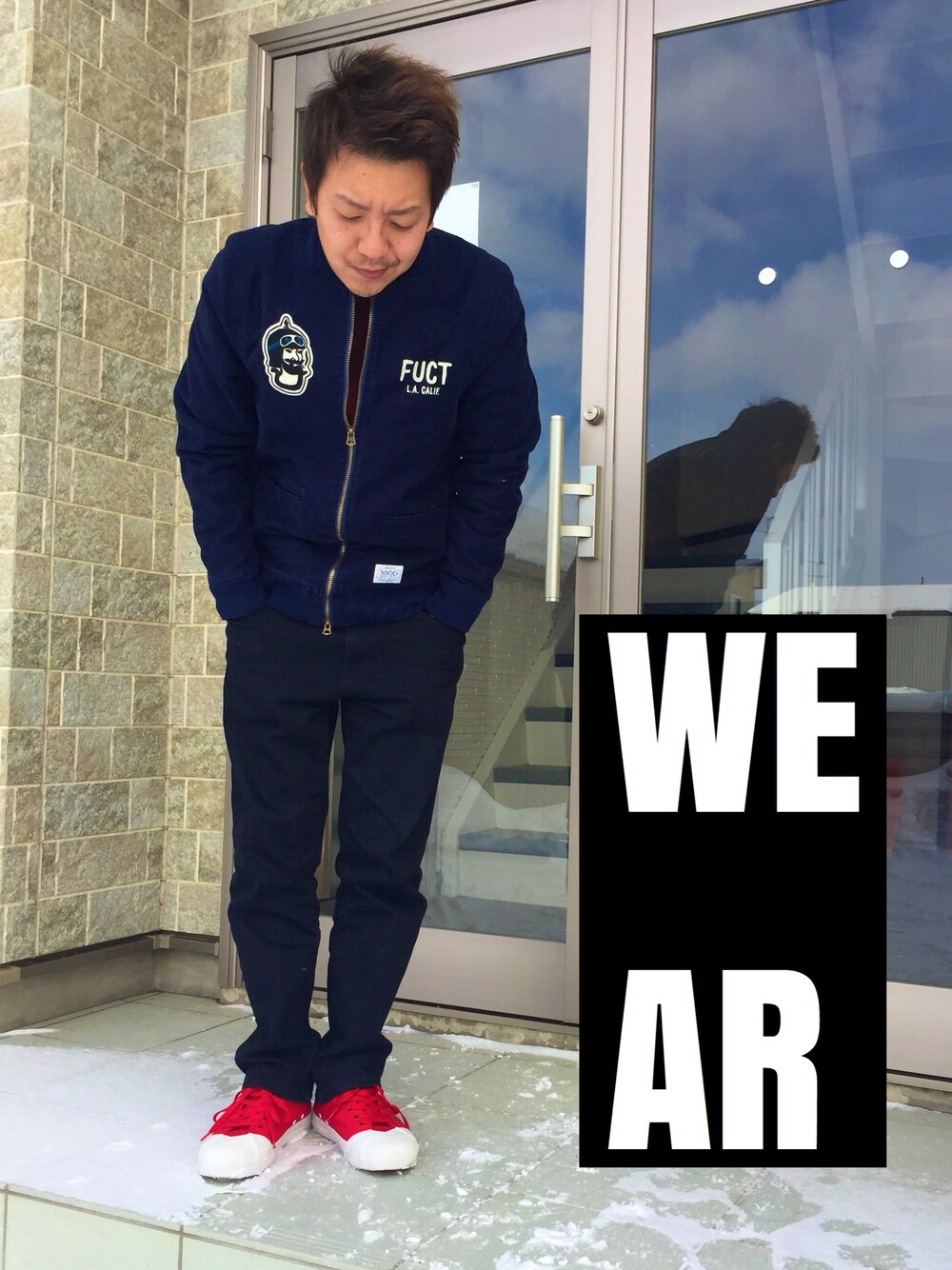 ジャケット FUCT トレーナー BRIXTON パンツ UNIQLO 靴 LOSERS 最近supremeなどのストリート系よりも、RUDEなファッションにはまってるようです。 足元を明るくして、ネイビーと赤が合いますね(^^)