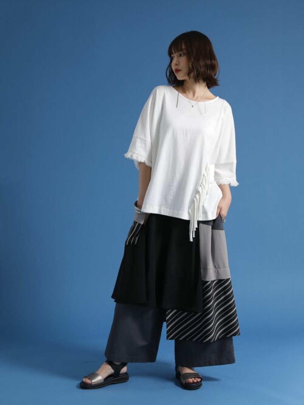 『人とは違う個性を表現する。』 まるでレイヤードのようなデザインのアシンメトリーパンツ。 軽やかなスーツ生地をベースに、シフォン生地や布帛生地、ストライプ生地を重ねることで、穿くだけで様になるヒラッと感が出ました。 モノトーンの配色だから個性派なのにどんなトップスとも合わせやすく、季節を問わずお洒落と穿きやすさを叶えます。 クリーンでモードな世界観に包み込まれる≪ kOhAKU ≫。 服と体の関係性を様々な角度から追及するドメスティックブランド。 ここでしか出会えない、計算されたデザイン性≪kOhAKU≫異素材MIXレイヤード風アシメパンツです。