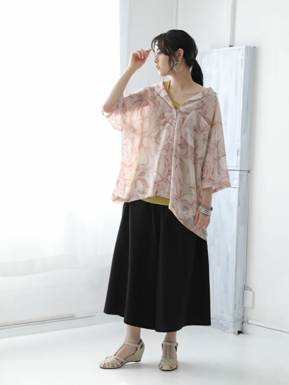 『こなれ感溢れるお洒落な彼女。』 ゆるラフなシルエットと、薄手でさらりとした心地よい生地が魅力♪ 暑い季節も涼し気印象のシアーシャツ! すっきりオープンカラーの衿元は上品な抜け感を演出。 ニュアンスたっぷりのマーブル柄で、落ち着いた大人女子の魅力が高まります♪ 今、好きな物、興味あることを自由な発想で表現できる≪ n'OrLABEL ≫。 「実用性と機能性、そして遊び感覚」、多面性を楽しめるピュアでモードなデザインライン。 着るだけですぐにお洒落になれる≪n'OrLABEL≫シアーマーブルプリントシャツです。
