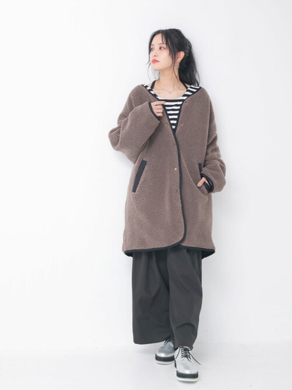 osharewalker staff(osharewalker ZOZO店)のノーカラーコート「『キルト×ボアリバーシブルコート』」を使ったコーディネート