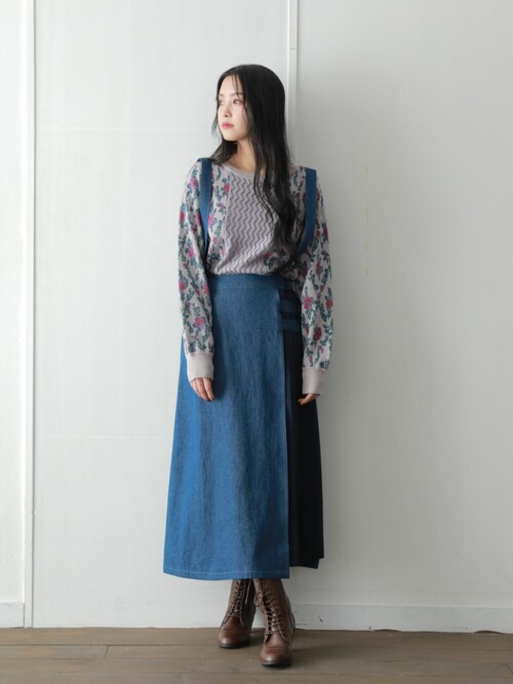 異素材を切り替えたアシンメトリーデザインが印象的な立ち姿を演出するデニムスカート。 三段階に長さを変えられるサスペンダー付きで、取り外しも可能だから2wayでお洒落が楽しめます。 調整できるダブルバックルベルトがお洒落なアクセントに♪ 柔らかで程よい厚みのデニム生地に、滑らかなプリーツ生地をドッキング。プリーツ部分には裏地付きで、ロングシーズン着用いただけます。 バックウエストゴム仕様だから穿き心地快適なのも嬉しいポイント♪ ひらり揺れて視線を奪う≪somari imagination≫サイドプリーツ切替デニムスカートです。