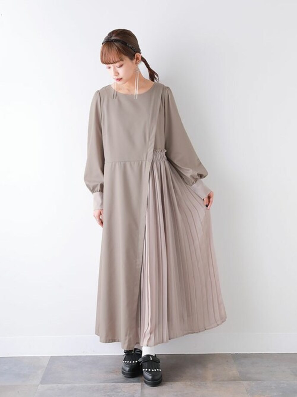 osharewalker staff(osharewalker ZOZO店)のワンピース「『異素材プリーツ切替アシメワンピース』」を使ったコーディネート